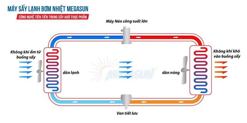 Máy sấy lạnh công nghệ cao MGS-DR-T được ứng dụng công nghệ sấy lạnh bơm nhiệt tiên tiến nhất hiện nay, có thể đáp ứng mọi nhu cầu sấy khô sản phẩm quy mô dân dụng, công nghiệp. Hệ thống sấy lạnh Megasun sử dụng công nghệ bơm nhiệt và phương thức thổi ngang, mang lại hiệu quả sấy khô cao, tiết kiệm năng lượng và bảo đảm chất lượng sản phẩm. Máy sấy lạnh bơm nhiệt chỉ tốn chi phí khoảng 40% so với sấy bằng dầu, 50% so với nồi hơi dùng than, 30% so với dùng điện trở.