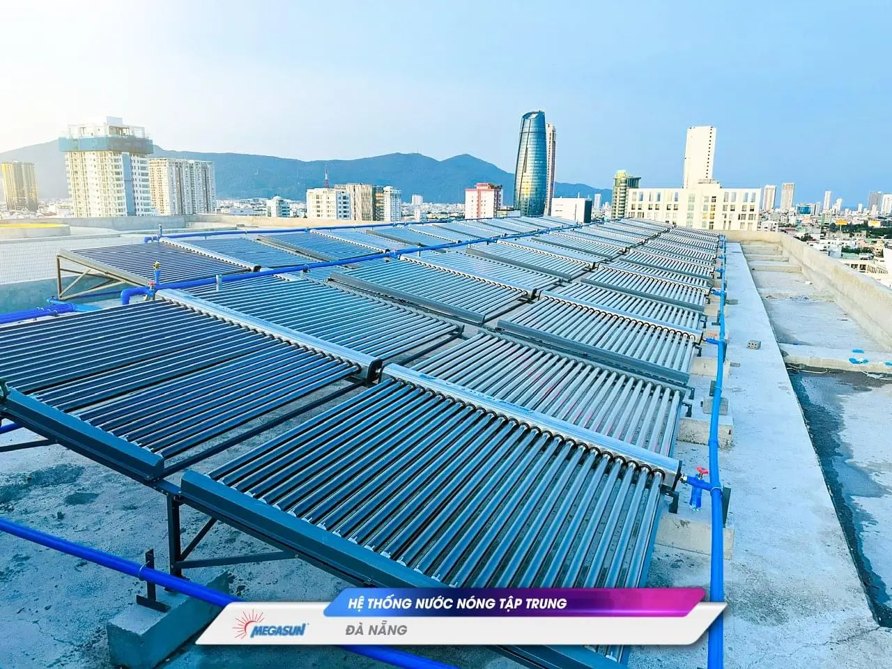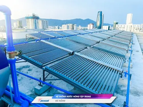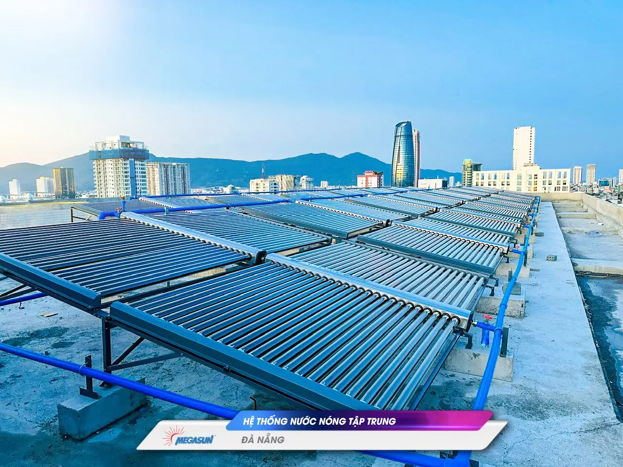 Megasun triển khai thi công hệ thống nước nóng trung tâm Megasun 15,000 Lít nước nóng / ngày. Hệ thống sử dụng năng lượng mặt trời kết hợp bơm nhiêt - heat pump. Thông tin hệ thống: Công suất: 15,000 Lít. Thành phần chính : 30 tấm thu nhiệt ống chân không Megasun MGS-VC1850: 50 tấm. Bồn bảo ôn giữ nhiệt Megasun 5m3 BBO-5000-KCA-D : 3 bồn. Bơm nhiệt - heat pump Megasun MGS-5HP : 3 cái .